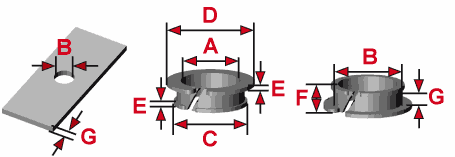 - Seitlich schräg geschlitzt, wodurch die Montage der Gleitlager von einer Seite ermöglicht wird. Nach der Montage spreizt sich das Lager und kleidet die Bohrung im Blech aus. Durch die Welle wird verhindert, dass sich das Clipslager aus der Bohrung löst. Selbst bei axialen Bewegungen kann das Gleitlager nicht aus der Bohrung rutschen.
