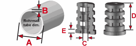 Die Sechskantmuttern befinden sich in konischen Kammern dieser zweiteiligen Polyamidbuchsen mit Bund. Beim Anziehen des Gewindes wird der Expanderstopfen an die Innenwand des Rohres gepresst (Dübeleffekt). Dieser Effekt erfordert ein vollständiges Anziehen des Gewindes.