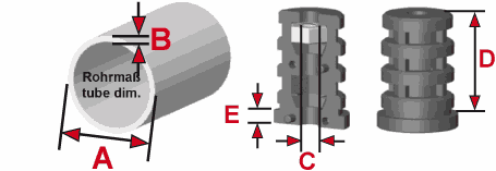 Die Sechskantmuttern befinden sich in konischen Kammern dieser zweiteiligen Polyamidbuchsen mit Bund. Beim Anziehen des Gewindes wird der Expanderstopfen an die Innenwand des Rohres gepresst (Dübeleffekt). Dieser Effekt erfordert ein vollständiges Anziehen des Gewindes.