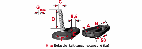 - Axiale statische Druckbelastbarkeit: 400 kg (bei 0° Neigung und max. 10 mm ausgedrehtem Gewinde).
